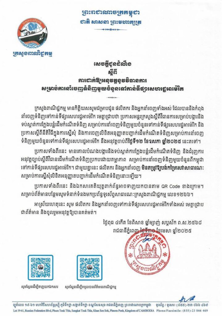 ក្រសួងពាណិជ្ជកមកមកាលពីថ្ងៃទី០១ ខែឧសភា ឆ្នាំ២០២៥នេះ បានចេញសេចក្តីជូនដំណឹងរបស់ ស្តីពី ការដាក់ឱ្យអនុវត្តនូវវិធានការ សម្រាប់ការនាំចេញទំនិញមួយចំនួនទៅកាន់ទីផ្សារសហរដ្ឋអាម៉េរិក។