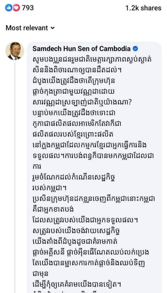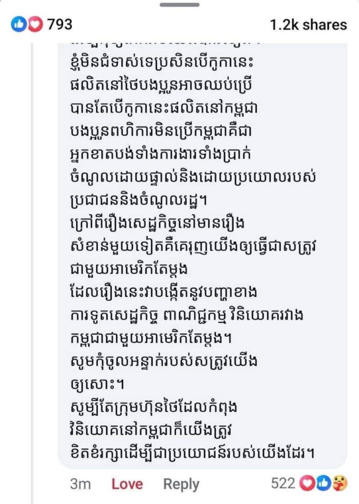 សារជាថ្មី ស្មារតី សំឡេង និងសកម្មភាពជួយគ្នា បង្ហាញនូវការគាំទ្ររបស់ប្រជាជនខ្មែរ ទាំងក្នុង និងក្រៅប្រទេស មិត្តភក្តិអន្តរជាតិដែលបានយល់ច្បាស់ និងបង្ហាញការគាំទ្រមកដល់ប្រទេសកម្ពុជា ទាំងអស់នេះហើយដែល ជាកម្លាំងពិតប្រាកដរបស់យើង ហើយ កម្លាំងនេះហើយដែលជាថាមពល ដល់រាជរដ្ឋាភិបាលនិងកងកម្លាំងរបស់យើងដើម្បី ដោះស្រាយ និងបញ្ចប់សង្រ្គាមមួយនេះ។ ការពហិការមិនប្រើប្រាស់ផលិតផលថៃ ដែលចេញមកពីការឈឺចាប់របស់បងប្អូនមួយចំនួន មិនខុសទេ ហើយខ្ញុំក៏យល់ តែយើងត្រូវគិតគូរបន្ថែមដូចអ្វីដែលសម្តេចតេជោ/ពុកបានលើកឡើងនៅក្នុងសារខាងក្រោមរបស់គាត់។ ច្បាស់ណាស់យើងត្រូវតែបន្តពង្រឹងសមត្ថភាពខ្លួនឯង ហើយច្បាស់ណាស់ថាយើងត្រូវធ្វើអ្វីៗដើម្បីការពារ ពង្រឹង និងពង្រីក ផលប្រយោជន៍ជាតិយើង ថ្ងៃនេះតទៅមុខ និងកាត់បន្ថយសកម្មភាពណាដែលអាចប៉ះពាល់ដល់ភាពរឹងមាំរបស់យើង ទាំងពេលបច្ចុប្បន្ន រយៈពេលមធ្យម និងវែងឆ្ងាយទៅមុខ។»
