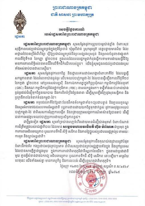 ថ្ងៃទី ១៧ ខែកញ្ញា ឆ្នាំ ២០២៥ រដ្ឋសភានៃព្រះរាជាណាចក្រកម្ពុជាបានចេញសេចក្ដីថ្លែងការណ៍ បង្ហាញពីការព្រួយបារម្ភយ៉ាងខ្លាំង ចំពោះសុខភាព និងសុវត្ថិភាពរបស់ប្រជាជនស្លូតត្រង់ នៅភូមិព្រៃចាន់ ឃុំអូរបីជាន់ ស្រុកអូរជ្រៅ ខេត្តបន្ទាយមានជ័យ ដែលត្រូវបានអាជ្ញាធរថៃប្រើអំពើហិង្សា បណ្តាលឲ្យប្រជាជន និងព្រះសង្ឃចំនួន ២៩ នាក់/អង្គ រងរបួសធ្ងន់ស្រាល ខណៈពេលកំពុងធ្វើការទាមទារដោយសន្តិវិធីសម្រាប់ការគោរពសិទ្ធិរស់រានមានជីវិតលើទឹកដីកំណើត។ រដ្ឋសភាបានជូនពរដល់អ្នករងរបួសទាំងអស់ឲ្យបានជាសះស្បើយក្នុងពេលឆាប់ៗនេះ។