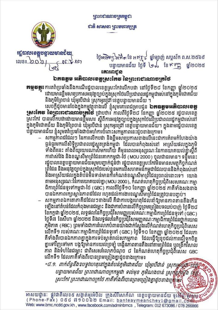 បន្ទាយមានជ័យ, ថ្ងៃទី២៩ ខែកញ្ញា ឆ្នាំ២០២៥ រដ្ឋបាលខេត្ត បន្ទាយមានជ័យ បានចេញសេចក្ដីប្រកាសតវ៉ាប្រឆាំងយ៉ាងតឹងរ៉ឹងចំពោះសកម្មភាពរដ្ឋបាលខេត្តស្រះកែវ នៃព្រះរាជាណាចក្រថៃ ដែលបានលើកបដានៅថ្ងៃទី២៨ ខែកញ្ញា ឆ្នាំ២០២៥ ដោយមានខ្លឹមសារអនុវត្តច្បាប់ក្នុងស្រុកថៃដោយអនុវត្តលើប្រជាពលរដ្ឋកម្ពុជារស់នៅក្នុងភូមិជោគជ័យ និងភូមិព្រៃចាន់ ឃុំអូរបីជាន់ ស្រុកអូរជ្រៅ ខេត្តបន្ទាយមានជ័យ។