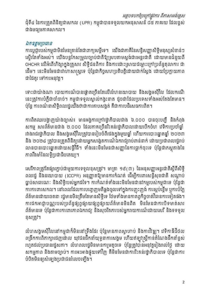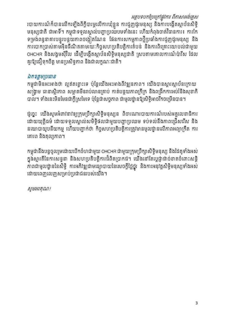 យ៉ាងណាមិញ កម្ពុជាក៏បានបញ្ជាក់បន្តពីការប្តេជ្ញាចូលរួមជាមួយ OHCHR និងដៃគូអន្តរជាតិទាំងអស់ ក្នុងស្មារតីនៃការសន្ទនា និងសហប្រតិបត្តិការដ៏ពិតប្រាកដ ដោយក្តោបក្តាប់សន្តិភាពជាមូលដ្ឋាន សេចក្ដីថ្លៃថ្នូរជាមធ្យោបាយ និងសិទ្ធិមនុស្សជាគោលដៅសម្រាប់ប្រជាពលរដ្ឋទាំងអស់។