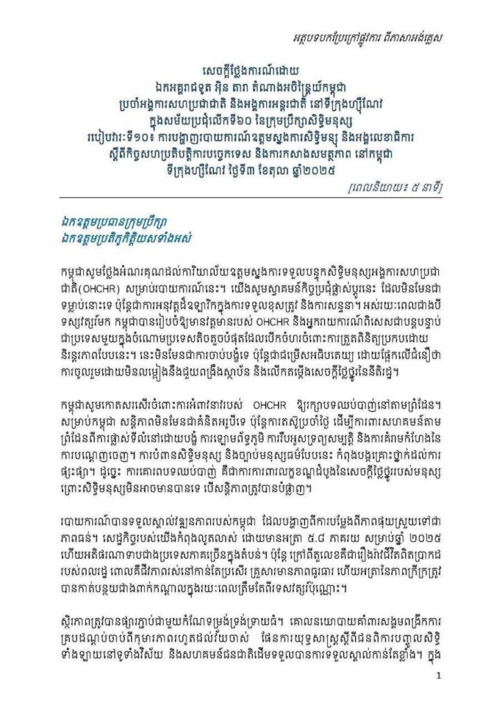 ទីក្រុងហ្សឺណែវ, ថ្ងៃទី៣ ខែតុលា ឆ្នាំ២០២៥ ឯកអគ្គរាជទូត អ៊ុន តារា តំណាងអចិន្ត្រៃយ៍កម្ពុជា ប្រចាំអង្គការសហប្រជាជាតិ និងអង្គការអន្តរជាតិ នៅទីក្រុងហ្សឺណែវ បានថ្លែងក្នុងសម័យប្រជុំលើកទី៦០ នៃក្រុមប្រឹក្សាសិទ្ធិមនុស្ស ក្រោមរបៀបវារៈទី១០ ស្តីពីកិច្ចសហប្រតិបត្តិការបច្ចេកទេស និងការកសាងសមត្ថភាពនៅកម្ពុជា។