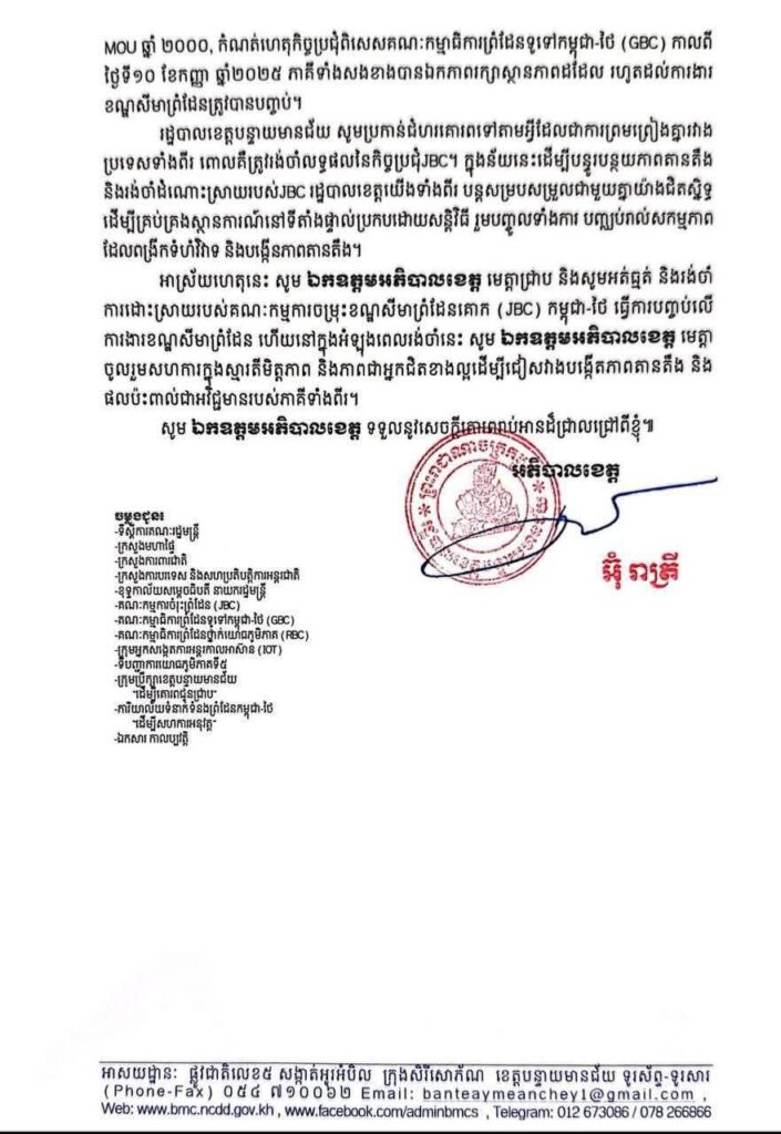 រដ្ឋបាលខេត្តបន្ទាយមានជ័យ ក៏បានអំពាវនាវឲ្យភាគីថៃ រង់ចាំលទ្ធផលនៃការដោះស្រាយពី គណៈកម្មការចម្រុះខណ្ឌសីមាព្រំដែនគោក (JBC) កម្ពុជា-ថៃ ហើយបន្តសហការជាមួយគ្នា ក្នុងស្មារតីមិត្តភាព និងភាពជាអ្នកជិតខាងល្អ ដើម្បីរក្សាសន្តិភាព និងជៀសវាងផលប៉ះពាល់អវិជ្ជមានរបស់ភាគីទាំងពីរ។