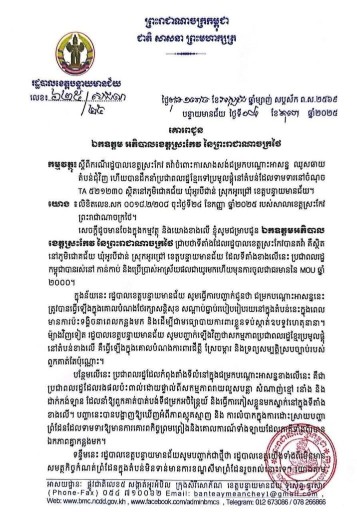 កាលពីថ្ងៃទី២៤ ខែកញ្ញា ឆ្នាំ២០២៥ សាលាខេត្តស្រះកែវ រដ្ឋបាលខេត្តបន្ទាយមានជ័យ បានបញ្ជាក់ថា ទីតាំងដែលរដ្ឋបាលខេត្តស្រះកែវបានតវ៉ានោះ ជាតំបន់ដែលប្រជាពលរដ្ឋកម្ពុជា បានរស់នៅ កាន់កាប់ និងប្រើប្រាស់អាស្រ័យផលជាយូរមកហើយ មុនការចូលជាធរមាននៃកិច្ចព្រមព្រៀង MOU ឆ្នាំ ២០០០។