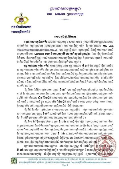 កងទ័ពជើងគោក អង្គភាពយោធភូមិភាគទី៥ បានឲ្យដឹងថា ពេលថ្មីៗនេះ មានគណនីហ្វេសប៊ុកឈ្មោះ Mey Dara បានបង្ហោះវីដេអូផ្សាយផ្ទាល់ និងធ្វើការបកស្រាយលើបណ្តាញព័ត៌មានមួយចំនួន ដូចជា Cambodia Daily និងបណ្តាញប្រឆាំងផ្សេងៗ ដែលមានមាតិកាបំផ្លើសការពិត វាយប្រហារលើរាជរដ្ឋាភិបាល និងប៉ះពាល់ដល់កិត្តិយស សេចក្ដីថ្លៃថ្នូរ និងឥទ្ធិពលរបស់កងយោធពលខេមរភូមិន្ទយ៉ាងធ្ងន់ធ្ងរ។