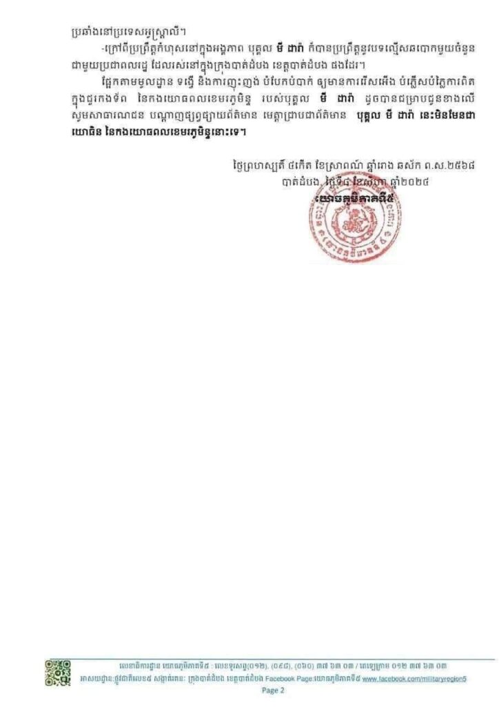 អង្គភាពយោធភូមិភាគទី៥ បានបញ្ជាក់ថា បុគ្គលឈ្មោះ មី ដារ៉ា ពិតជាធ្លាប់បម្រើកងទ័ពនៅអង្គភាពយោធភូមិភាគទី៥ ពីឆ្នាំ ១៩៩១ ដល់ឆ្នាំ ២០២៣ ជាវរសេនីយ៍ នាយរងការិយាល័យអភិវឌ្ឍន៍។ ទោះជាយ៉ាងណា ក្នុងអំឡុងពេលបម្រើការងារ គាត់បានប្រព្រឹត្តបទល្មើស និងបំពានវិន័យជាច្រើនដង ហើយត្រូវបានអនុវត្តវិធានការអប់រំ និងព្រមានជាច្រើនលើកពីថ្នាក់ដឹកនាំ។