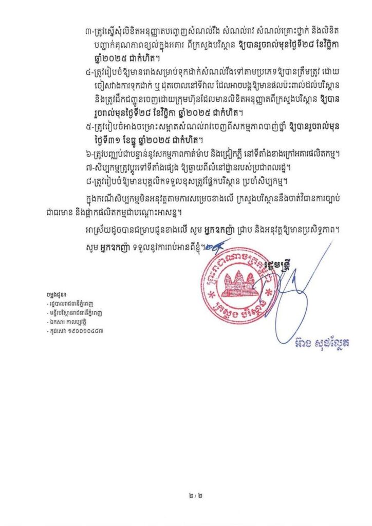 ៣. ស្នើសុំលិខិតអនុញ្ញាតបញ្ចេញសំណល់រឹង សំណល់រាវ សំណល់គ្រោះថ្នាក់ និងលិខិតបញ្ជាក់គុណភាពខ្យល់ក្នុងអគារ ពីក្រសួងបរិស្ថាន មុនថ្ងៃទី ២៨ វិច្ឆិកា ២០២៥។