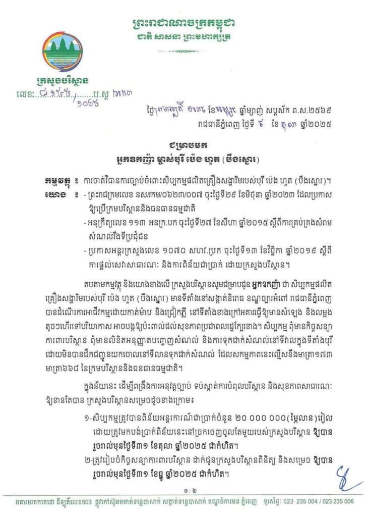 ១. ពិន័យជាប្រាក់ចំនួន ២០,០០០,០០០ រៀល (ម្ភៃលានរៀល) ហើយត្រូវបង់មុនថ្ងៃទី ៣១ តុលា ២០២៥ នៅច្រកចេញចូលតែមួយរបស់ក្រសួងបរិស្ថាន។