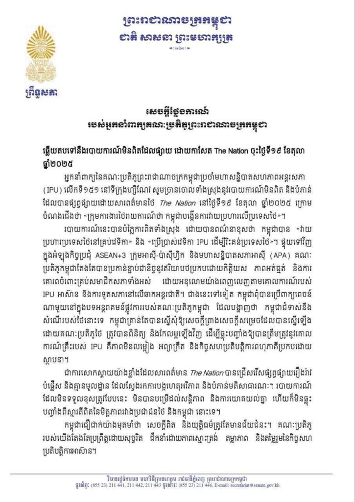 ថ្ងៃទី១៩ តុលា ២០២៥ – អ្នកនាំពាក្យគណៈប្រតិភូព្រះរាជាណាចក្រកម្ពុជាប្រចាំមហាសន្និបាតសហភាពអន្តរសភា (IPU) លើកទី១៥១ នៅទីក្រុងហ្សឺណែវបានឲ្យដឹងថា កម្ពុជាច្រានចោលនូវរបាយការណ៍មិនពិតដែលផ្សាយដោយកាសែត The Nation ក្រោមចំណងជើង “ក្រុមការងារថៃរាយការណ៍ថា កម្ពុជាបង្កើនការវាយប្រហារលើប្រទេសថៃ”។