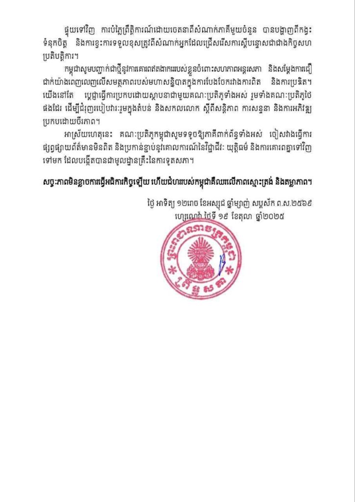 កម្ពុជាបានបញ្ជាក់ឡើងវិញអំពីការគោរពឥតលំអៀងចំពោះសហភាពអន្តរសភា និងជឿជាក់លើសមត្ថភាពរបស់មហាសន្និបាតក្នុងការបំបែករវាង “ការពិត” និង “ការប្រឌិត” ដោយបន្តប្តេជ្ញាធ្វើការជាមួយគណៈប្រតិភូទាំងអស់ រួមទាំងថៃ ដើម្បីជំរុញសន្តិភាព ការសន្ទនា និងការអភិវឌ្ឍដ៏ចីរភាពក្នុងតំបន់ និងលើឆាកសកល។