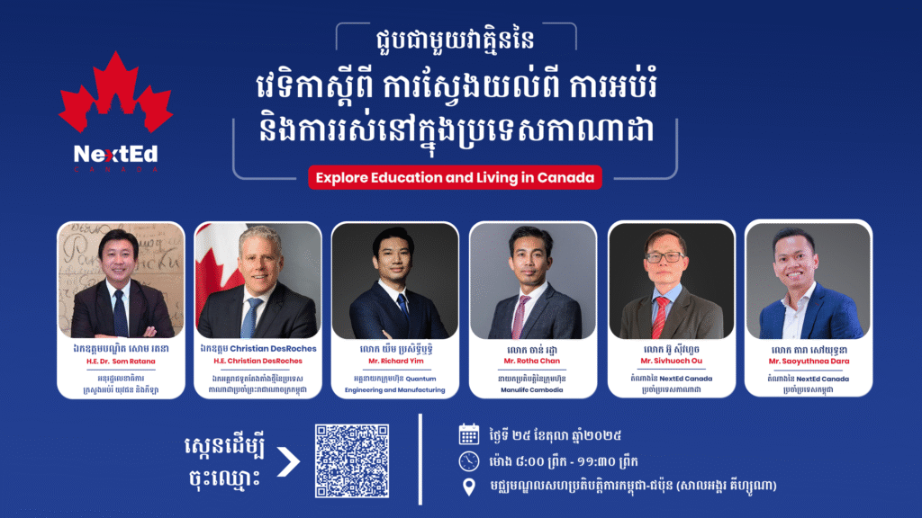 រាជធានីភ្នំពេញ, ថ្ងៃទី ២៥ តុលា ២០២៥ ចាប់ពីម៉ោង ៨ៈ០០ ព្រឹក ដល់ម៉ោង ១១ៈ៣០ ព្រឹក — វេទិកាចែករំលែកស្ដីពី “ស្វែងយល់ពីការអប់រំ និងការរស់នៅក្នុងប្រទេសកាណាដា” នឹងត្រូវបានរៀបចំឡើងនៅ សាលអង្គរ-គីហ្សូណានៃមជ្ឈមណ្ឌល CJCC ក្នុងបរិវេណសាកលវិទ្យាល័យភូមិន្ទភ្នំពេញដើម្បីផ្ដល់ឱកាសដល់សិស្ស និស្សិត អាណាព្យាបាល និងសាធារណជនក្នុងការស្វែងយល់ឲ្យបានកាន់តែទូលំទូលាយពីការអបំរំ និងការរស់នៅប្រចាំថ្ងៃនៅក្នុងប្រទេសកាណាដា។ សិស្ស និស្សិត ឬអាណាព្យាបាលដែលចាប់អារម្មណ៍បញ្ជូនបុត្រធីតាទៅសិក្សានៅប្រទេសកាណាដាពីថ្នាក់វិទ្យាល័យ រហូតដល់សាកលវិទ្យាល័យ ឬការសិក្សាវគ្គជំនាញអាចចុះឈ្មោះចូលរួមក្នុងកម្មវិធីនេះបាន និងអាចសួរសំណួរទៅវាគ្មិនជំនាញដែលរួមមានទាំងអតីតនិស្សិតខ្មែរដែលបានបញ្ចប់ការសិក្សាពីប្រទេសកាណាដា ហើយត្រឡប់មកប្រទេសកម្ពុជាវិញដើម្បីបង្កើតអាជីវកម្មរបស់ខ្លួនដោយជោគជ័យដោយប្រើប្រាស់ចំណេះដឹង ជំនាញ និងបទពិសោធពីប្រទេសកាណាដា។