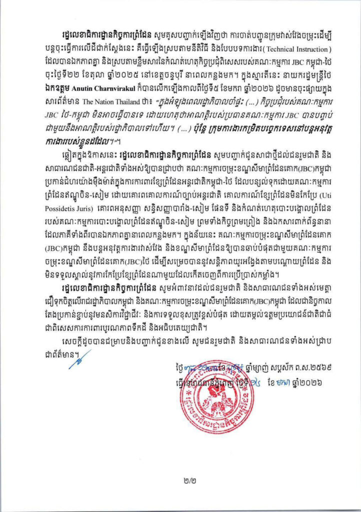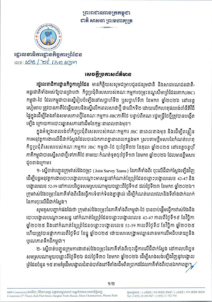 នៅថ្ងៃទី១៤ ខែមករា ឆ្នាំ២០២៦ រដ្ឋលេខាធិការដ្ឋានកិច្ចការព្រំដែនបានឲ្យដឹងថា កិច្ចប្រជុំពិសេសរបស់គណៈកម្មការចម្រុះខណ្ឌសីមាព្រំដែនគោក(JBC) កម្ពុជា-ថៃ ដែលកម្ពុជាបានស្នើរៀបចំឡើងនៅសប្តាហ៍ទី២ ឬសប្តាហ៍ទី៣ ខែមករា ឆ្នាំ២០២៦ នៅខេត្ត សៀមរាប ត្រូវបានភាគីថៃឆ្លើយតបនិងស្នើលើកពេលសាជាថ្មី ជាលើកទី២ ដោយលើកហេតុផលរង់ចាំនីតិវិធី ផ្ទៃក្នុងដើម្បីតែងតាំងសមាសភាពថ្មីនៃគណៈកម្មការ-JBCភាគីថៃ បន្ទាប់ពីគណៈរដ្ឋមន្ត្រីថៃថ្មីត្រូវបានបង្កើត ឡើង ក្រោយការបោះឆ្នោតសភានៅដើមខែកុម្ភៈនាពេលខាងមុខ។