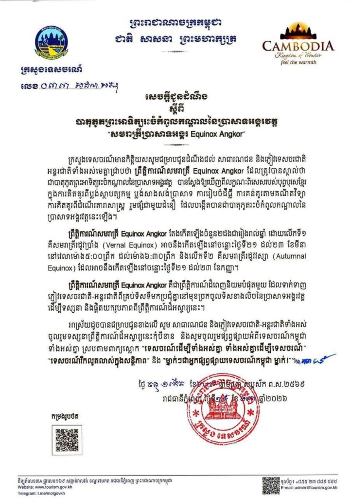 នៅរសៀលថ្ងៃទី២៧ ខែកុម្ភៈ ឆ្នាំ២០២៦ ក្រសួងទេសចរណ៍បានចេញសេចក្ដីប្រកាសថា ព្រឹត្តិការណ៍សមរាត្រី Equinox Angkor ដែលត្រូវបានស្គាល់ថា ជាបាតុភូតព្រះអាទិត្យរះចំកណ្តាលនៃប្រាសាទអង្គរវត្ត បានស្តែងឱ្យឃើញពីលក្ខណៈពិសេសរបស់បុព្វបុរសខ្មែរ ក្នុងការគិតគូរពីប្លង់ស្ថាបត្យកម្ម ប្លង់សាងសង់ប្រាសាទ ការរៀបចំដីធ្លី ការគន់គូរតាមគណិតវិទ្យា ការគិតគូរពីដំណើរតារាសាស្ត្រ រួមផ្សំជាមួយជំនឿ ដែលបង្កើតបានជាបាតុភូតរះចំកំពូលកណ្តាលនៃ ប្រាសាទអង្គរវត្តនេះឡើង។