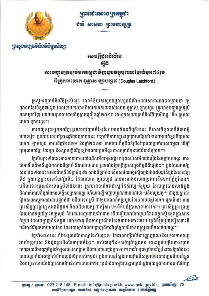 ក្រសួងវប្បធម៌និងវិចិត្រសិល្បៈ បានចេញសេចក្ដីជូនដំណឹងថា វត្ថុបុរាណ​ខ្មែរចំនួន៧៤រូប ដែលទាមទារបានពីការកាន់កាប់របស់លោក ឌូគ្លាស ឡាចហ្វដ ត្រូវបានបញ្ជូនត្រឡប់មកកម្ពុជាវិញ ដោយ​​​​​​​​​​អនុលោមតាមកិច្ចព្រមព្រៀងឆ្នាំ២០២០ រវាងក្រសួងវប្បធម៌និងវិចិត្រសិល្បៈ និង គ្រួសារលោក ឡាចហ្វដ នៅរសៀលថ្ងៃទី២៧ ខែកុម្ភៈ ឆ្នាំ២០២៦នេះ។