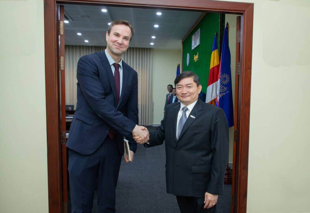 នាថ្ងៃចន្ទ ទី៩ ខែមីនា ឆ្នាំ២០២៦ ឯកឧត្ដម ហេង សួរ រដ្ឋមន្ត្រីក្រសួងការងារ និងបណ្ដុះបណ្ដាលវិជ្ជាជីវៈ បានទទួលជួបសម្តែងការគួរសម និងពិភាក្សាការងារជាមួយលោក Jochen M. Schmittmann តំណាងប្រចាំតំបន់របស់មូលនិធិរូបិយវត្ថុអន្តរជាតិ (IMF) សម្រាប់កម្ពុជា ឡាវ និងវៀតណាម និងសហការី នៅទីស្តីការក្រសួង ដើម្បីធ្វើបច្ចុប្បន្នភាពការងារ ផ្លាស់ប្តូរយោបល់លើការស្រូបទាញកម្លាំងពលកម្ម ការអភិវឌ្ឍជំនាញ ជាពិសេស ការធ្វើសមាហរណកម្មពលករទេសន្តរប្រវេសន៍មកពីប្រទេសថៃ។