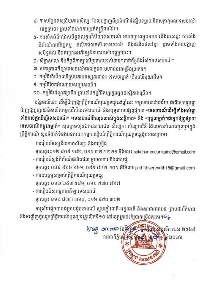 នាព្រឹកថ្ងៃទី១៧ ខែមីនា ឆ្នាំ២០២៦នេះ ដោយទទួលបានការអនុញ្ញាតជាគោលការណ៍ដ៏ខ្ពង់ខ្ពស់ពីរាជរដ្ឋាភិបាល ក្រសួងទេសចរណ៍សហការជាមួយ រដ្ឋបាលខេត្តក្រចេះ ក្រសួង ស្ថាប័នពាក់ព័ន្ធ និងវិស័យឯកជន បានរៀបចំព្រឹត្តិការណ៍បុណ្យទន្លេលើកទី១០ ឆ្នាំ២០២៦ នៅខេត្តក្រចេះ ក្រោមប្រធានបទ «ទន្លេបៃតង បេតិកភណ្ឌវប្បធម៌ និងធម្មជាតិមហាសាល» ដែលនឹងប្រព្រឹត្តទៅចាប់ពីថ្ងៃទី២៧ ដល់ថ្ងៃទី២៩ ខែមីនា ឆ្នាំ២០២៦។