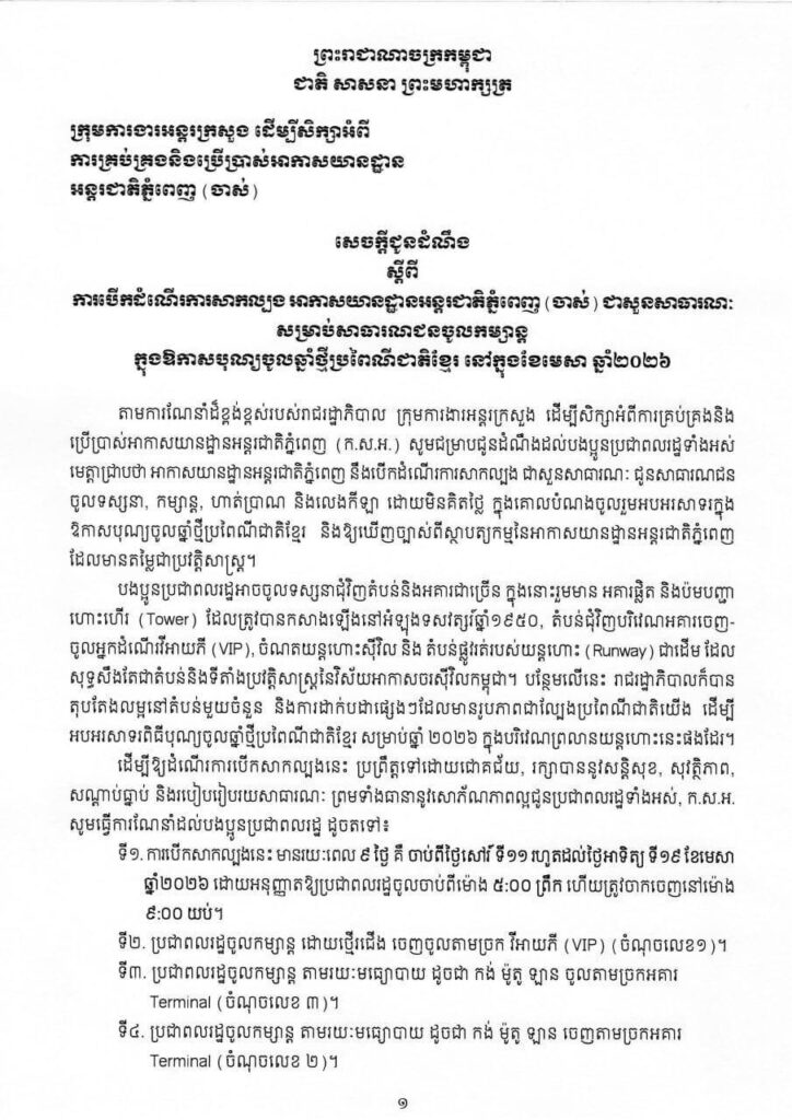 នាថ្ងៃទី៦ ខែមេសា ឆ្នាំ២០២៦នេះ តាមការណែនាំដ៏ខ្ពង់ខ្ពស់របស់រាជរដ្ឋាភិបាល ក្រុមការងារអន្តរក្រសួង ដើម្បីសិក្សាអំពីការគ្រប់គ្រងនិង ប្រើប្រាស់អាកាសយានដ្ឋានអន្តរជាតិភ្នំពេញ (ក.ស.អ.) បានឲ្យដឹងថា អាកាសយានដ្ឋានអន្តរជាតិភ្នំពេញ នឹងបើកដំណើរការសាកល្បង ជាសួនសាធារណៈ ជូនសាធារណជន ចូលទស្សនា, កម្សាន្ត, ហាត់ប្រាណ និងលេងកីឡា ដោយមិនគិតថ្លៃ ក្នុងគោលបំណងចូលរួមអបអរសាទរក្នុង ឱកាសបុណ្យចូលឆ្នាំថ្មីប្រពៃណីជាតិខ្មែរ និងឱ្យឃើញច្បាស់ពីស្ថាបត្យកម្មនៃអាកាសយានដ្ឋានអន្តរជាតិភ្នំពេញ ដែលមានតម្លៃជាប្រវត្តិសាស្ត្រ។