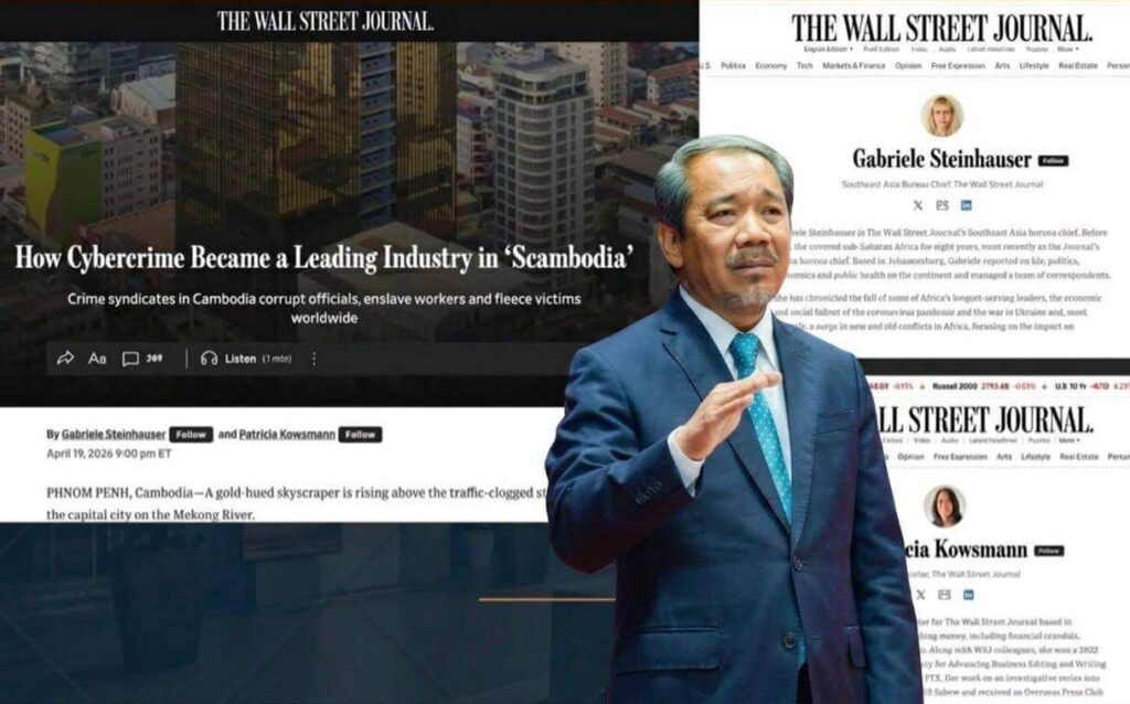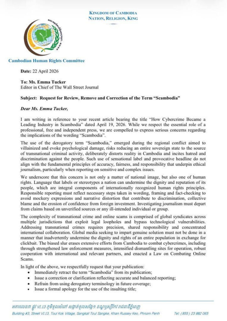 គណៈកម្មាធិការសិទ្ធិមនុស្សកម្ពុជា (គ.ស.ម.ក.) បានផ្ញើលិខិតតវ៉ាជាផ្លូវការទៅកាន់ការិយាល័យនិពន្ធនៃសារព័ត៌មានអន្តរជាតិ The Wall Street Journal បន្ទាប់ពីស្ថាប័ននេះបានប្រើប្រាស់ពាក្យ “Scambodia” នៅក្នុងអត្ថបទចុះផ្សាយនាថ្ងៃទី១៩ ខែមេសា ឆ្នាំ២០២៦ ដែលត្រូវបានចាត់ទុកថាជាការរំលោភបំពានយ៉ាងធ្ងន់ធ្ងរលើវិជ្ជាជីវៈសារព័ត៌មាន និងសេចក្តីថ្លៃថ្នូររបស់ប្រជាជនកម្ពុជា។