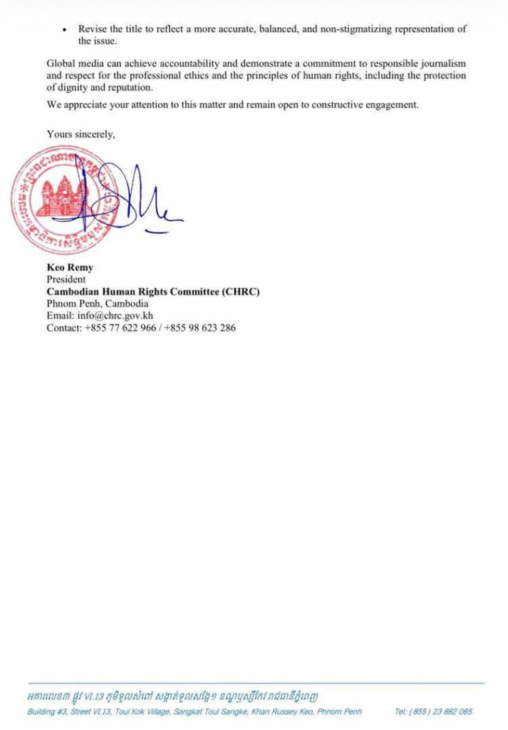 នៅក្នុងសេចក្តីថ្លែងការណ៍ដែលចេញផ្សាយនាពេលថ្មីៗនេះ គ.ស.ម.ក. បានលើកឡើងថា ការប្រើប្រាស់ពាក្យពេចន៍ក្នុងរូបភាពលាបពណ៌ និងបំភ្លៃការពិតបែបនេះ គឺជាការបង្ហាញពីកង្វះក្រមសីលធម៌សារព័ត៌មាន ដែលនាំឱ្យមានការយល់ច្រឡំ និងការរើសអើងជាសកលមកលើកេរ្តិ៍ឈ្មោះរបស់កម្ពុជា។ គណៈកម្មាធិការបានសង្កត់ធ្ងន់ថា សកម្មភាពនេះបានប៉ះពាល់យ៉ាងខ្លាំងដល់កិត្តិយសរបស់ប្រជាជនកម្ពុជាជិត ១៨ លាននាក់ ដែលត្រូវបានធានាការពារដោយធម្មនុញ្ញអង្គការសហប្រជាជាតិ និងច្បាប់សិទ្ធិមនុស្សអន្តរជាតិ។