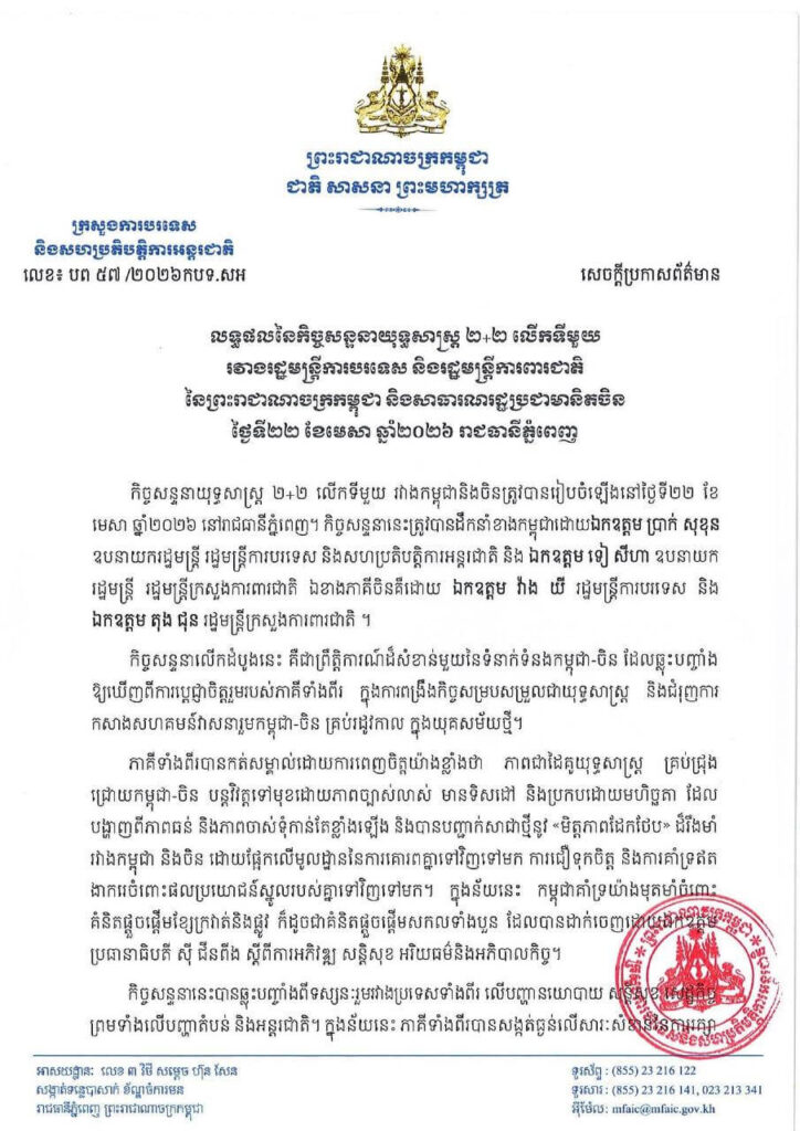 ក្រសួងការបរទេស និងសហប្រតិបត្តិការអន្តរជាតិ បានបង្ហាញពី លទ្ធផលនៃកិច្ចសន្ទនាយុទ្ធសាស្ត្រ ២+២ លើកទីមួយ រវាងរដ្ឋមន្ត្រីការបរទេស និងរដ្ឋមន្ត្រីការពារជាតិ នៃព្រះរាជាណាចក្រកម្ពុជា និងសាធារណរដ្ឋប្រជាមានិតចិន ថ្ងៃទី២២ ខែមេសា ឆ្នាំ២០២៦ រាជធានីភ្នំពេញ។