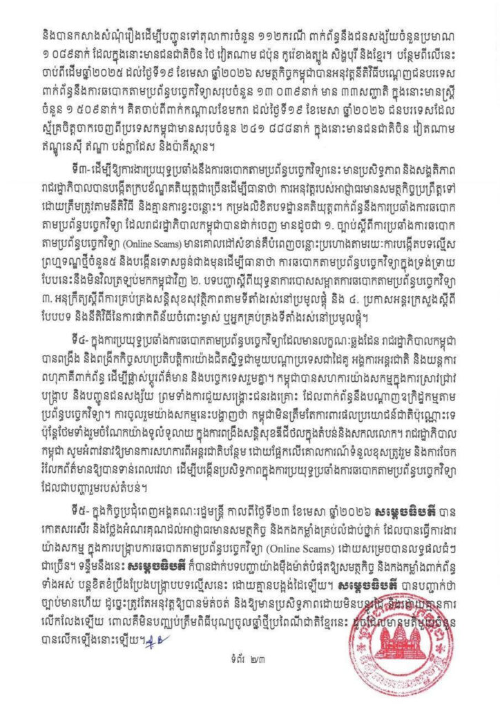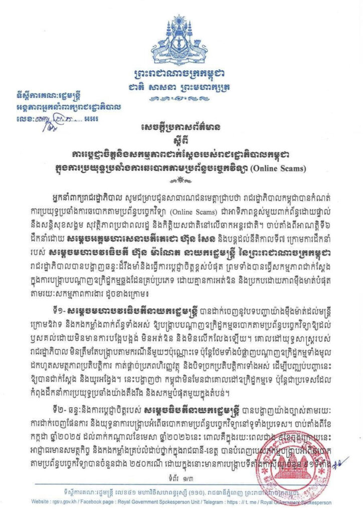អ្នកនាំពាក្យរាជរដ្ឋាភិបាល នារសៀលថ្ងៃទី២៤ ខែមេសា ឆ្នាំ២០២៦ បានឲ្យដឹងថា រាជរដ្ឋាភិបាលកម្ពុជា បានកំណត់ ការប្រយុទ្ធប្រឆាំងការឆបោកតាមប្រព័ន្ធបច្ចេកវិទ្យា (Online Scams) ជាអាទិភាពខ្ពស់មួយពាក់ព័ន្ធដោយផ្ទាល់ នឹងសន្តិសុខសង្គម សុវត្ថិភាពប្រជាពលរដ្ឋ និងកិត្តិយសជាតិនៅលើឆាកអន្តរជាតិ។