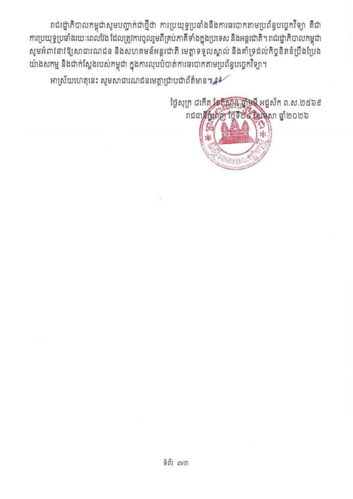 ដោយឡែក រាជរដ្ឋាភិបាលកម្ពុជា បានបញ្ជាក់ជាថ្មីថា ការប្រយុទ្ធប្រឆាំងនឹងការឆបោកតាមប្រព័ន្ធបច្ចេកវិទ្យា គឺជា ការប្រយុទ្ធប្រឆាំងរយៈពេលវែង ដែលត្រូវការចូលរួមពីគ្រប់ភាគីទាំងក្នុងប្រទេស និងអន្តរជាតិ។ រាជរដ្ឋាភិបាលកម្ពុជា ក៏បានសំណូមពរឱ្យសាធារណជន និងសហគមន៍អន្តរជាតិ មេត្តាទទួលស្គាល់ និងគាំទ្រដល់កិច្ចខិតខំប្រឹងប្រែង យ៉ាងសកម្ម និងជាក់ស្តែងរបស់កម្ពុជា ក្នុងការលុបបំបាត់ការឆបោកតាមប្រព័ន្ធបច្ចេកវិទ្យា។